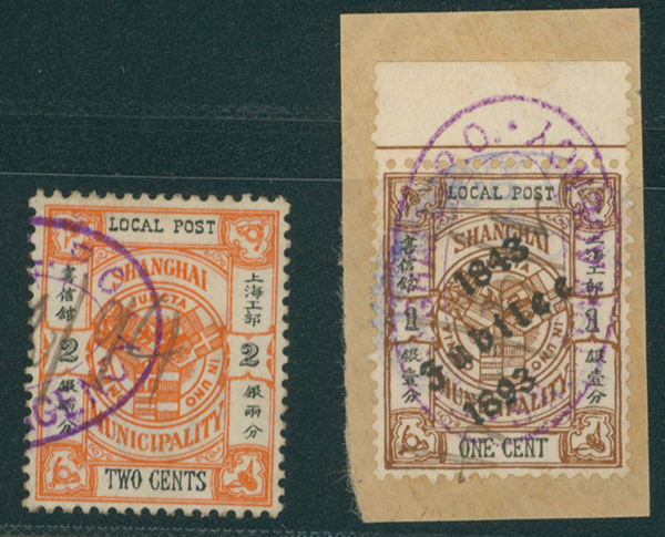 カテゴリー:中国海関 シングルロット China 1893 Two "SHANGHAI L.P.O./SWATOW AGENCY" oval cancel on Shanghai Local Post's Coat of Arms stamps. The date is handwritten used (中華人民共和国|中国)最低値: 7,000 円